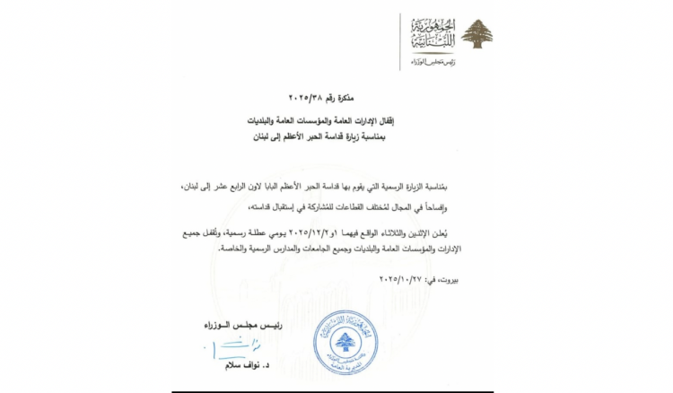 أصدر رئيس مجلس الوزراء نواف سلام مذكرة رقم 38/2025 قضت بإقفال الإدارات والمؤسسات العامة والبلديات بمناسبة زيارة الحبر الأعظم البابا لاون الرابع عشر إلى لبنان.