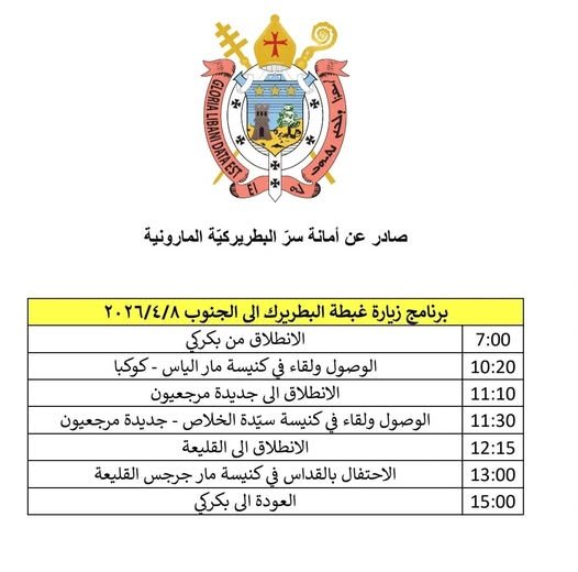 يقوم البطريرك الماروني مار بشارة بطرس الراعي بزيارة راعوية إلى الجنوب اليوم الأربعاء ، تشمل عددًا من البلدات و وفق البرنامج التالي: