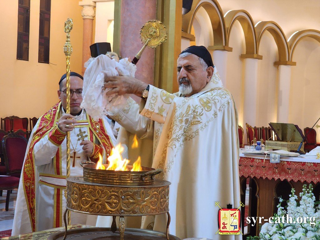 في بداية القداس، أقام غبطته الرتبة الخاصّة بعيد الميلاد بحسب الطقس السرياني الأنطاكي. وفي نهايتها، رنّم غبطته الإنجيل المقدس، وخلاله أشعل ناراً في موقدة، وزيّح فوقها الطفل يسوع. ثمّ قام بتطواف في الكاتدرائية حاملاً الطفل يسوع، يتقدّمه الإكليروس، فيما الجوق ينشد تسبحة الملائكة “المجد لله في الأعالي وعلى الأرض السلام والرجاء الصالح لبني البشر”، وترانيم الميلاد. وبعد ذلك، وضع غبطتُه الطفلَ يسوع في المكان المُعَدّ كمذود داخل المغارة التي نُصِبَت بجانب المذبح.