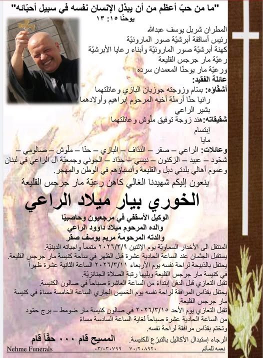 نعى رئيس أساقفة أبرشيّة صور المارونيّة المطران شربل عبدالله وكهنة الأبرشيّة وأبناء رعاياها ورعيّة مار جرجس- القليعة ورعيّة مار يوحنّا المعمدان- سرده، الوكيل الأسقفيّ في مرجعيون وحاصبيا الخوري بيار الرّاعي الّذي حمل صليبه وانتقل إلى الأخدار السّماويّة أمس الإثنين، بعد أن قرّر الصّمود في بلدة القليعة مع أهلها والتّرسّخ في الأرض شاهدًا للمحبّة والرّجاء والسّلام.