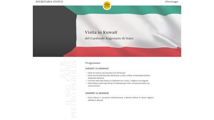 بدأ أمين سر دولة حاضرة الفاتيكان الكاردينال بارولين زيارة إلى الكويت هذا الخميس تستمر لغاية يوم غد الجمعة، تتخللها زيارة إلى المسجد الأكبر ودار الآثار الإسلامية، بالإضافة إلى كاتدرائية العائلة المقدسة وبازيليك سيدة العرب.