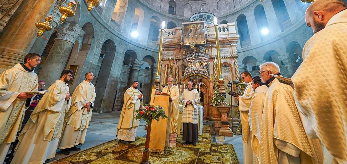 وهكذا، مرة أخرى، هنا في القبر المقدّس، في النقطة نفسها التي تغيّر فيها مسار التاريخ، لا نكتفي بإلقاء كلمات مجاملة للمناسبة. بل نتخذ قرارًا. ونعلن إعلانًا يتجاوزنا ويسبقنا: المسيح قام! ولأنه قام من بين الأموات، فلن نجده أبدًا في المكان الذي وضعناه فيه. بل سنجده أمامنا، يدعونا للخروج من قيودنا.