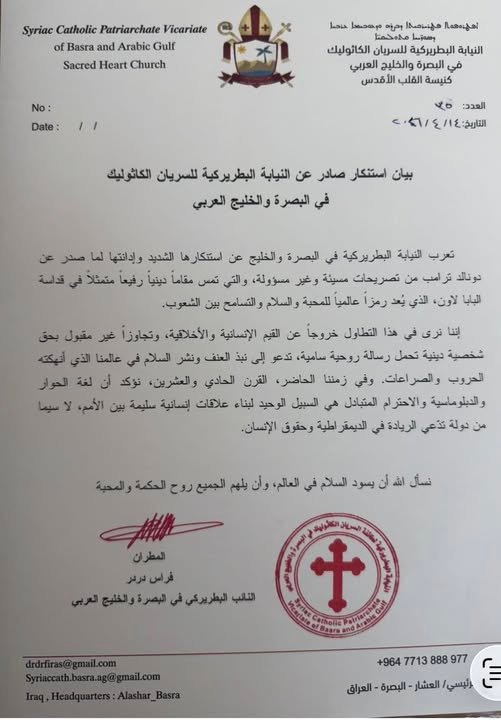 تعرب النيابة البطريركية في البصرة والخليج عن استنكارها الشديد وإدانتها لما صدر عن دونالد ترامب من تصريحات مسيئة وغير مسؤولة، والتي تمس مقاماً دينياً رفيعاً متمثلاً في قداسة البابا لاون الرابع عشر، الذي يُعد رمزاً عالمياً للمحبة والسلام والتسامح بين الشعوب.