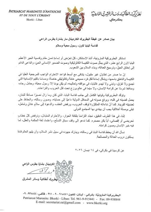 تستنكر البطريركية المارونية، أشدّ الاستنكار، كلّ تعرّضٍ أو إساءةٍ تمسّ مقام وقدسية الحبر الأعظم البابا لاون الرابع عشر، الذي يمثّل صوت الكنيسة الكاثوليكية وصوت الضمير الإنساني الحيّ، والداعي الدائم إلى إحقاق الحقّ، وترسيخ العدالة، وبناء السلام بين الشعوب.