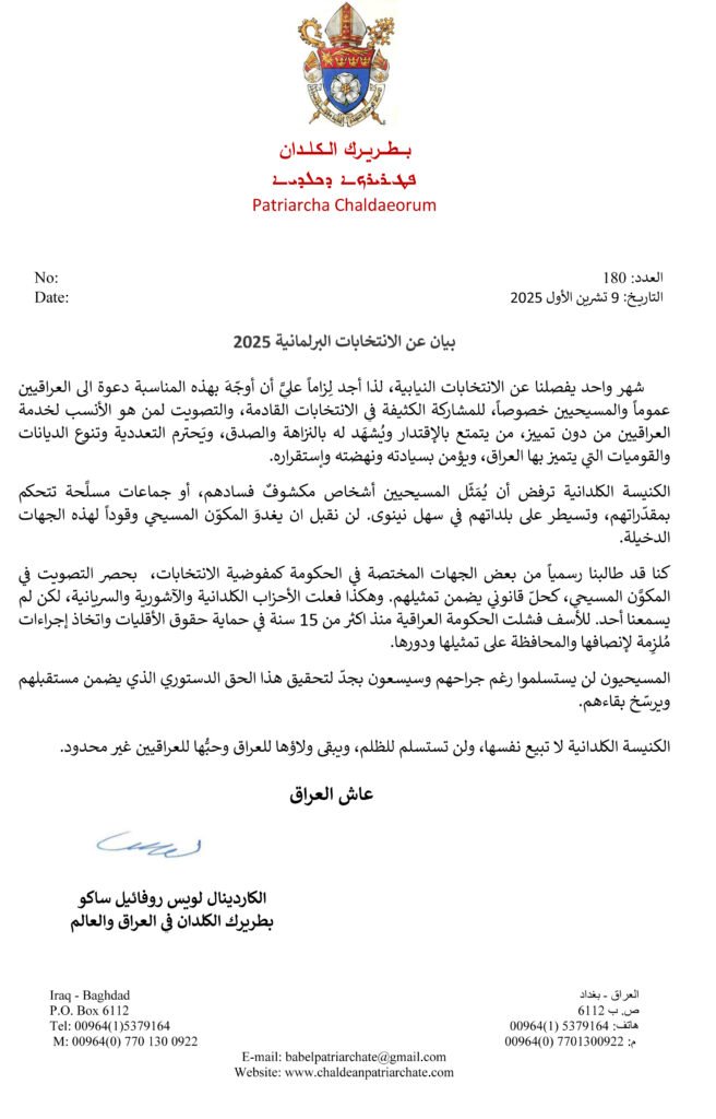 بمناسبة إقتراب الانتخابات النيابية العراقية لهذا العام، يوجّه غبطة البطريرك الكاردينال لويس روفائيل ساكو رسالة الى العراقيين عامةً والمسيحيين خاصةً، لأهمية هذا الموضوع الحيوي في بناء مستقبل العراق، قال فيها: