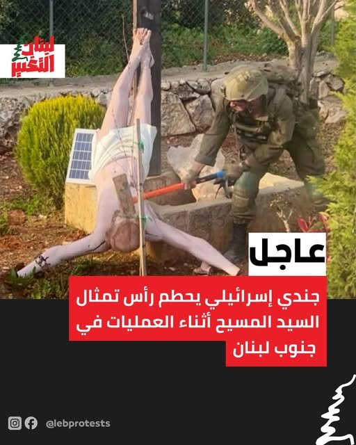تحطيم رأس تمثال السيد المسيح 20 أبريل، 2026 جندي إسرائيليي يتباهى بتحطيم رأس تمثال السيد المسيح أثناء العمليات في جنوب لبنان أخبار ذات صلة:التعدديّة في سوريا تحت المجهر... تحطيم التماثيل «جرس إنذار» حضاريّالسفير البابوي هورغان: حملتُ قرب البابا إلى الشعب المتألم في السودان"برصاص جندي إسرائيلي".. مقتل امرأة وابنتها في الرعية الكاثوليكية بغزةالسودان: راهبات القلب الأقدس يُعتبرن مرساة نجاة بالنسبة للنازحين من جنوب السودانفيديو لاقتحام جنود إسرائيليين لكنيسة في دير ميماس الجنوبية وسخريتهم من مراسم الزواجالعبسي افتتح يوما دراسيا عن "الفن المسيحي في بطريركية أنطاكية": للحفاظ على هذا التراث الثقافي الثمين ونقله إلى…