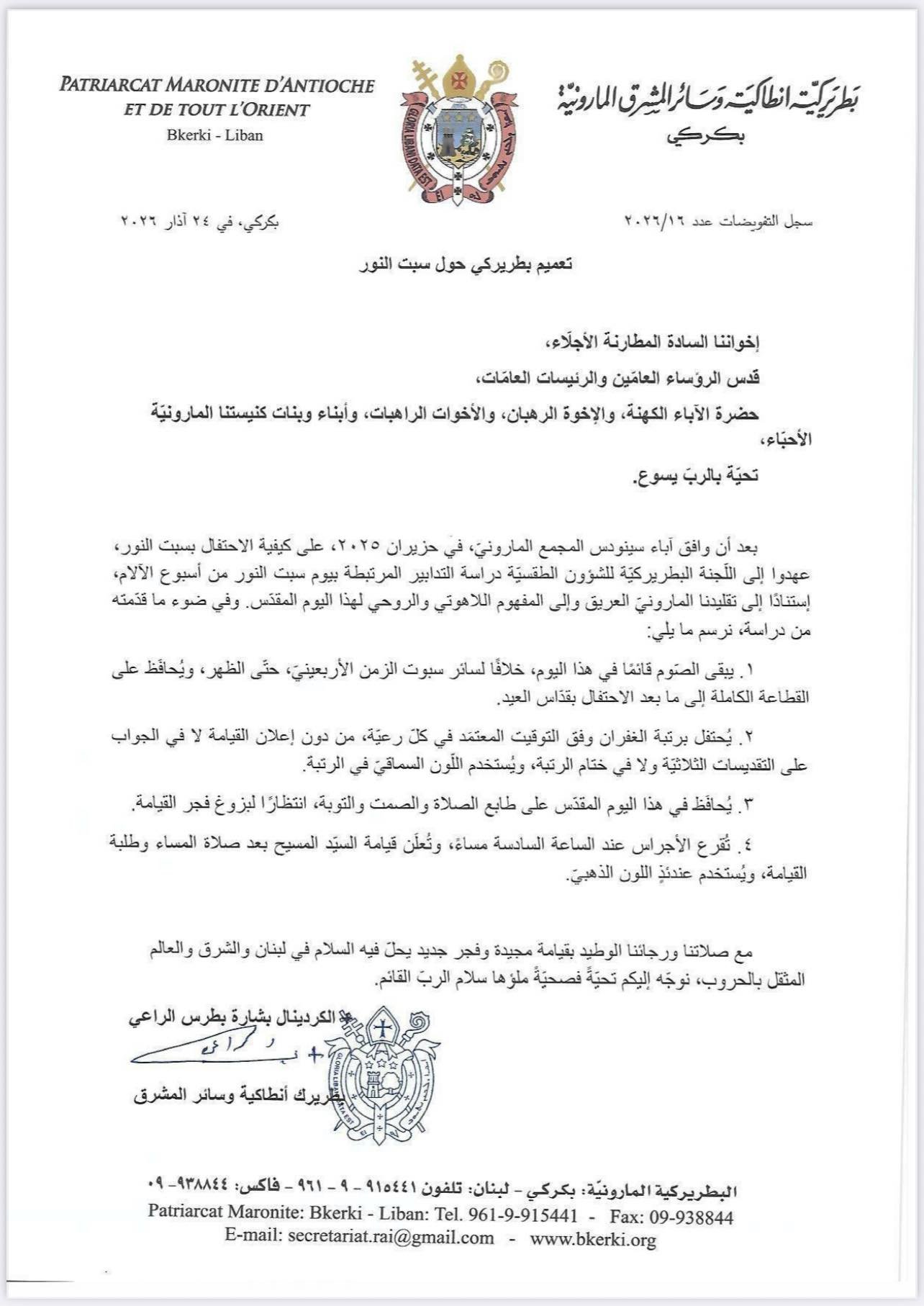 وجّه البطريرك المارونيّ الكاردينال مار بشارة بطرس الرّاعي تعميمًا بطريركيًّا خاصًّا بسبت النّور، جاء فيه: