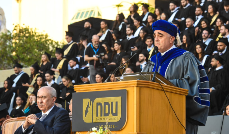 ليختم الأب الرئيس: “العالَمُ لَكُم، هيّا انطلقوا وانجحوا حيْثُ فَشِلَ كثيرون. إذهبوا أقوياءَ، فالجامعة مكَّنَتْكُم وأعْطَتْكُم ما تحتاجونَ إليهِ لمواجهة تحدّيات العصرِ وفي مُقَدِّمِها الذكاءً الاصطناعيّ المطلوب استثماره بذكائِكُم الطبيعيّ. الجامعة رَفَعَتْ مناعَتِكُم الفِكريّةِ لتكونوا روّاداً وقادةً وَصُنّاعَ حداثةٍ ومستقبل. لا ترضَوا بأن تكونوا سلعةً للتصديرِ أو للبيعِ في الأسواقِ. كابروا واعرفوا قيمةَ أنفُسِكُم وأهميّةَ الشهادةَ التي ستتسلّمون بعد قليلٍ، ولتكُنْ جوازَ سَفَرِكُم وعُبورِكُم إلى الابداع والتألق. كونوا أرقاماً صعبةً في شتّى معادلاتِ التغيير وكونوا أبرز اللاعبين على حَلَبَةِ التفوّق، هيّا انطلقوا، اجتاحوا العالمَ، فالعالمُ لَكُم”.