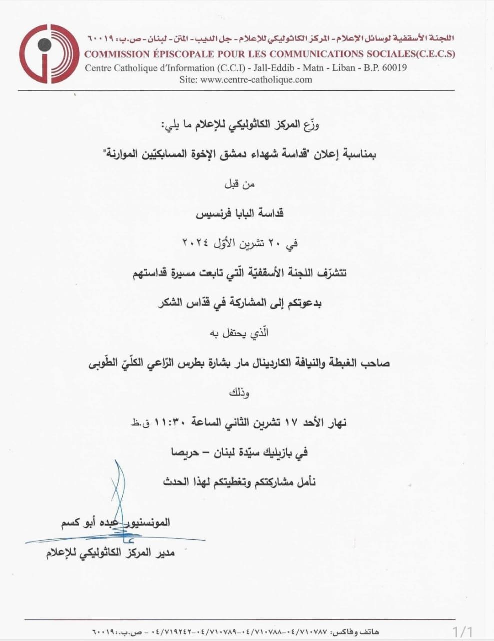 بدعوتكم إلى المشاركة في قدّاس الشكر الّذي يحتفل به
