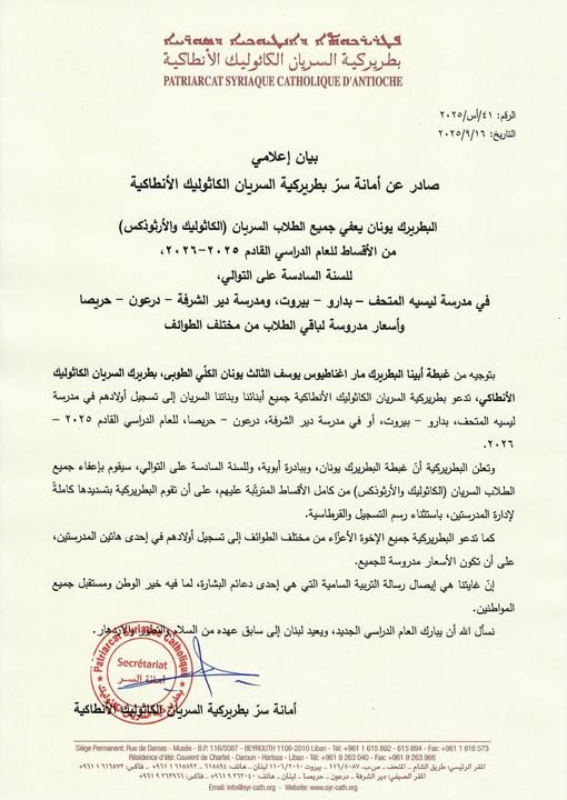 يهمّنا أن ننشر فيما يلي نصّ البيان الإعلامي الصادر عن أمانة سرّ بطريركية السريان الكاثوليك الأنطاكية، والذي يعلن عن قيام غبطة البطريرك مار اغناطيوس يوسف الثالث يونان بطريرك السريان الكاثوليك الأنطاكي، للسنة السادسة على التوالي، بإعفاء جميع الطلاب السريان (الكاثوليك والأرثوذكس) المسجَّلين في مدرسة ليسيه المتحف – بدارو – بيروت، وفي مدرسة دير الشرفة – درعون – حريصا، من الأقساط للعام الدراسي القادم 2025-2026، وستكون أسعار الأقساط مدروسة للطلاب من مختلف الطوائف في هاتين المدرستين: