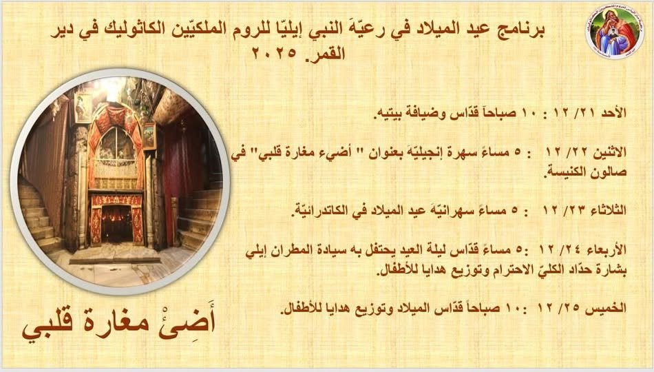 قداس ليلة العيد يحتفل به سيادة المطران إيلي بشارة حداد، ويتخلله توزيع هدايا للأطفال.