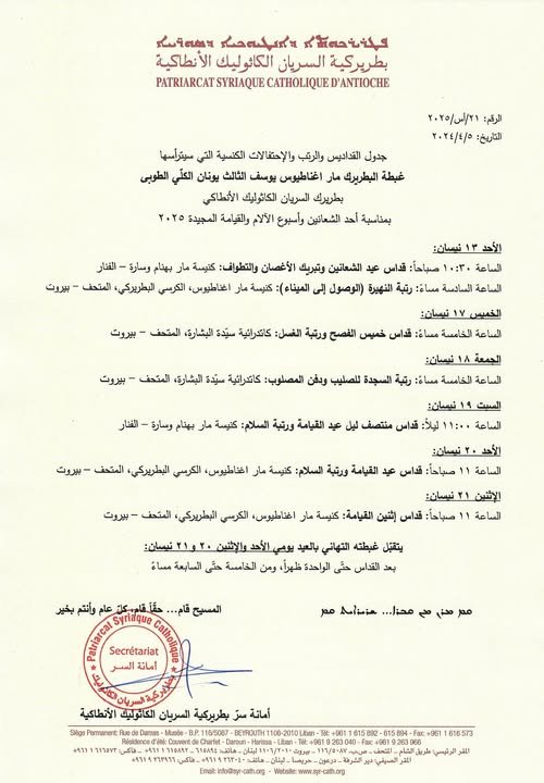 يطيب لنا أن ننشر فيما يلي جدول القداديس والرتب والإحتفالات الكنسية التي سيترأسها غبطة البطريرك مار اغناطيوس يوسف الثالث يونان الكلّي الطوبى بطريرك السريان الكاثوليك الأنطاكي بمناسبة أحد الشعانين وأسبوع الآلام والقيامة المجيدة 2025
