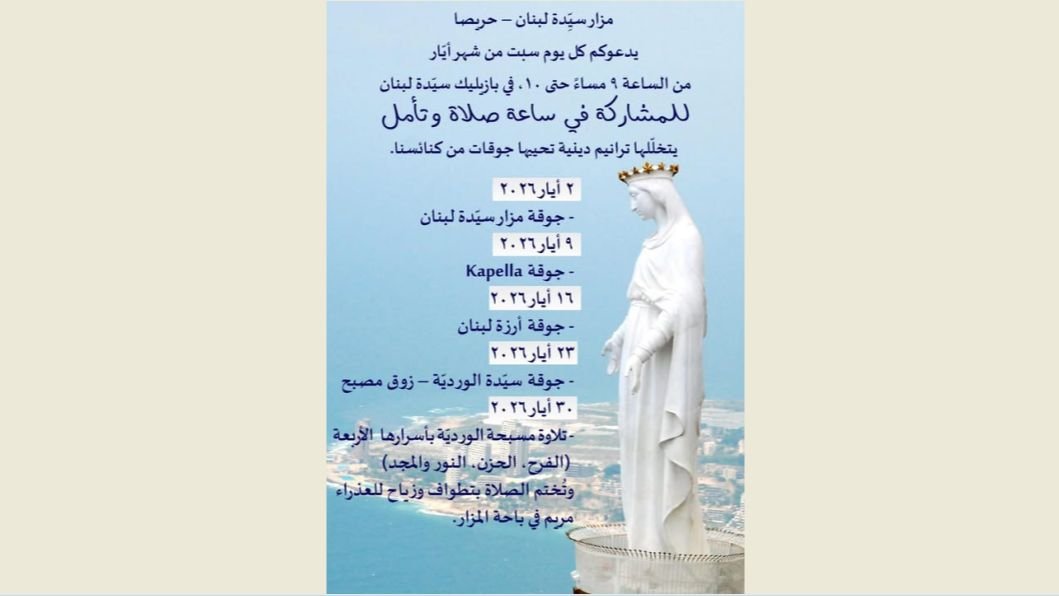 دعا مزار سيدة لبنان – حريصا في بيان، المؤمنين إلى “المشاركة في ساعة صلاة وتأمل تُقام كل يوم سبت من شهر أيار، من الساعة التاسعة مساءً حتى العاشرة، في بازيليك سيدة لبنان، ضمن أجواء روحية مميزة يحييها المزار خلال الشهر المريمي”.