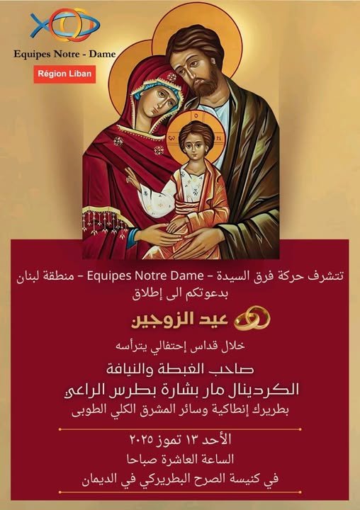 ندعوكم للمشاركة في قدّاس “عيد الزوجين” الذي أطلقته منطقة لبنان في فرق السيدة، وذلك في 13 تموز 2025 في الصرح البطريركي في الديمان، يترأسه غبطة أبينا البطريرك مار بشارة بطرس الراعي.