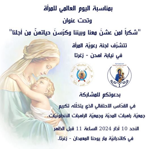 قداس لمناسبة اليوم العالمي للمرأة الأحد ١٠ آذار ٢٠٢٤ الساعة ١١:٠٠صباحا كنيسة مار يوحنا المعمدان زغرتا أخبار ذات صلة:التأمل الأول لزمن المجيء مع واعظ القصر الرسوليالمطران نفاع:* تخليداً لذكراه وعرفاناً بالجميل قرّرت رعية اهدن زغرتا إقامة تمثال للأب سمعان عاقله الاهدني...…البطريرك يونان يحتفل بالقداس بمناسبة عيد مار يوحنّا المعمدان والذكرى الثامنة والعشرين للرسامة الأسقفية لغبطته…الرّهبانيّة اللّبنانيّة المارونيّة تنشر الإرشادات الخاصّة بتنظيم زيارة البابا إلى عنّايازغرتا تحتفل بعيد السيدة بقداس في كنيسة البلدةقداس على نية شهداء زغرتا الزاوية في كنيسة مار يوحنا المعمدان – زغرتا التاريخ: 8 مارس, 2024 - 10 مارس, 2024