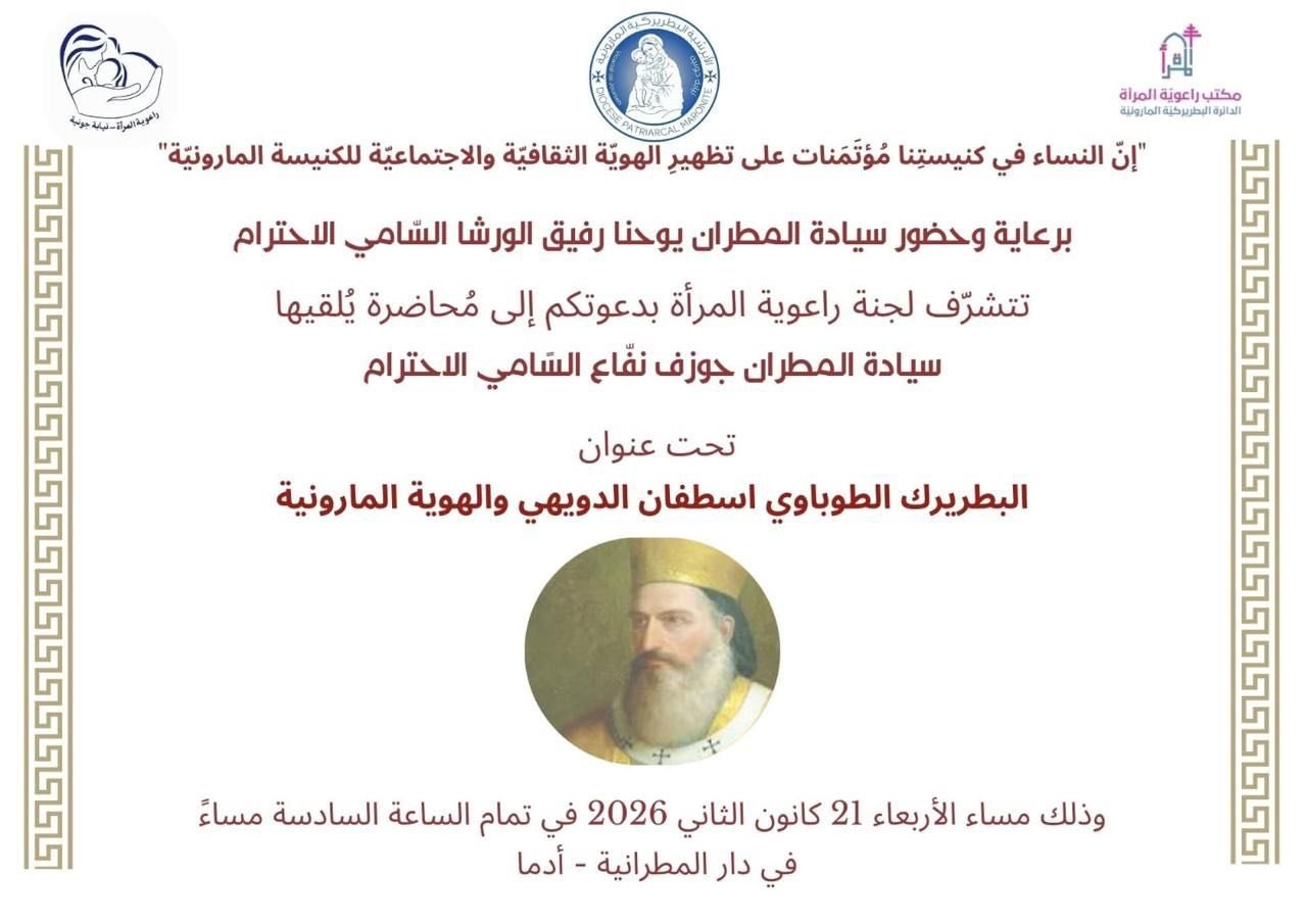 تتشرف لجنة راعوية المرأة بدعوتكم للمشاركة في محاضرة روحية وثقافية مميّزة،