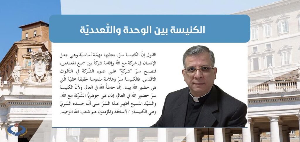 بهذه الكلمات ينوي بولس الرّسول توضيح الوحدة والتّعدديّة في الوقت نفسه الّتي هي الكنيسة: “فكما أَنَّ لَنا أَعضاءً كَثيرةً في جَسَدٍ واحِد، ولَيسَ لِجَميعِ هذِه الأَعضاءِ عَمَلٌ واحِد، فكذلِكَ نَحنُ في كَثْرَتِنا جَسَدٌ واحِدٌ في المسيح لأَنَّنا أَعضاءُ بَعضِنا لِبَعْض” (روم 12، 4-5). يريد القدّيس بولس القول أنَّ الكنيسة ليست له وليست لنا: الكنيسة جسد المسيح، هي “كنيسة اللّه”، حقل اللّه، بناءً اللّه، هيكل اللّه” (1 قوّر 3، 9، 16). الكنيسة سرّ إرادة اللّه الخلاصيّة؛ اللّه الّذي يريد أن يخلّص الجميع وأن يبلغوا لمعرفة الحقيقة (طيمو 2، 4). الكنيسة، سرّ “شركةٍ” على ضوء الشّركة في الثّالوث الأقدس “فَلْيكونوا بِأَجمَعِهم واحِداً: كَما أَنَّكَ فِيَّ، يا أَبَتِ، وأَنا فيك فَلْيكونوا هُم أَيضاً فينا لِيُؤمِنَ العالَمُ بِأَنَّكَ أَنتَ أَرسَلتَني” (يو 17: 21). “الكنيسة سرّ وعلامة ملموسة لحقيقة مخفيّة الّتي هي حضور اللّه بيننا؛ أنّها حاملةٌ اللّه في العالم”. ولأنّ الكنيسة سرّ حضور اللّه في العالم، إذن هي جوهريًّا الشّركة مع اللّه.
